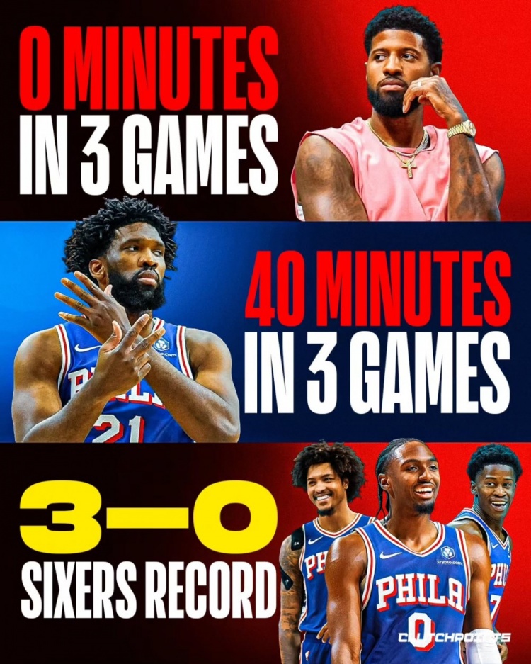 76ers 3 wins and 0 losses! Embiid played a total of 40 minutes in three games, George 0 minutes