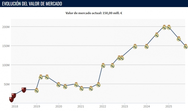 However, since missing the Golden Globes last year, Vinicius's value has dropped rapidly, falling to 170 million euros in June this year, and now it has fallen to 150 million euros. In the past year, its value has shrunk by one quarter.