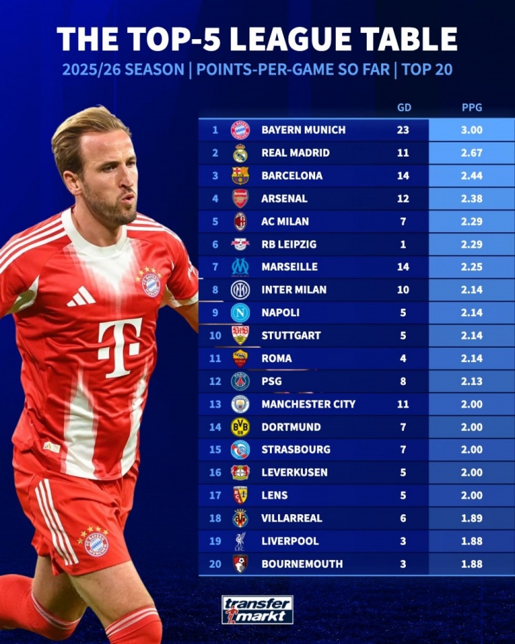 "Transfer Market" calculated the average points per game of the five major league teams this season. Bayern, Real Madrid, Barcelona, and Arsenal ranked among the top four.