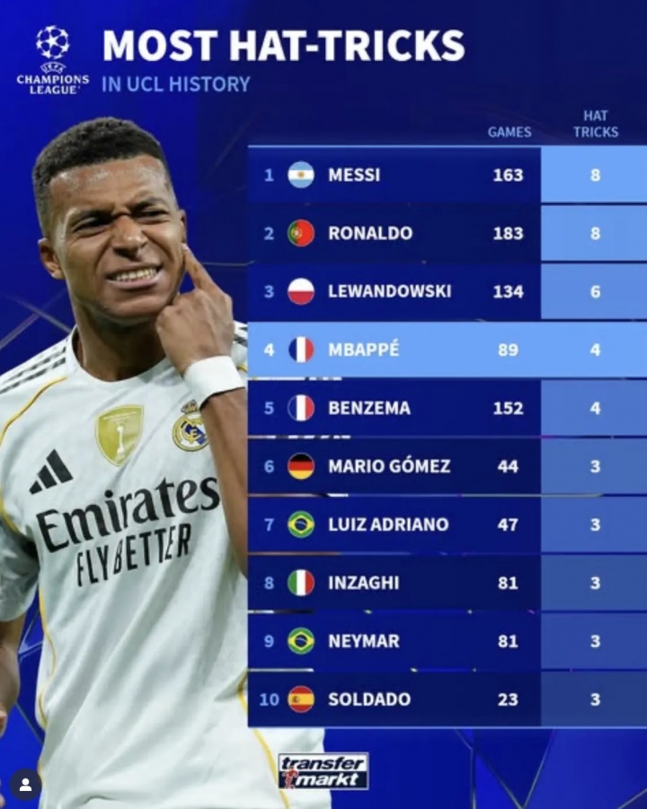 In this round of Champions League, Real Madrid defeated Almaty Keirat 5-0, and Mbappe scored a hat-trick. The following are the number of hat-tricks in Champions League history: