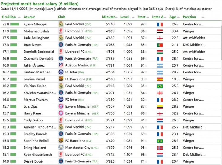 NanSports > Football > CIES ranking of the highest annual salary deserved by players: Mbappe ranks first with 22.8 million euros, Salah ranks second