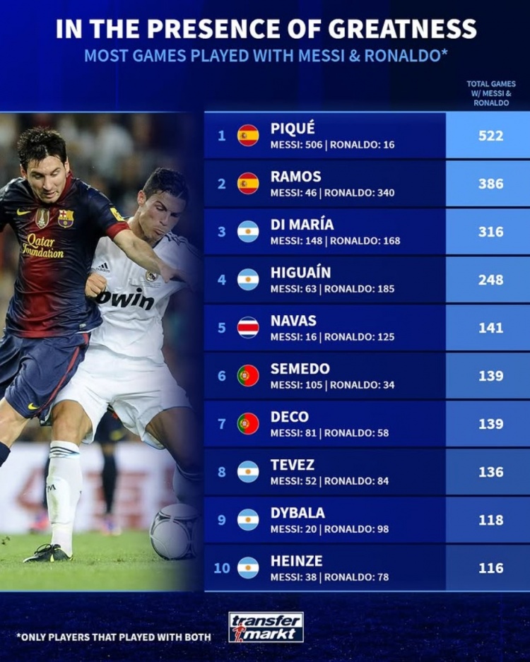 "Transfer Market" counts the number of players who have worked with Messi and Ronaldo, and Pique ranks first.