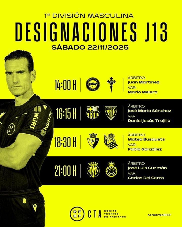 The Spanish Football Federation today announced the referee list for the four La Liga games on Saturday (including the early morning of Sunday), as follows: